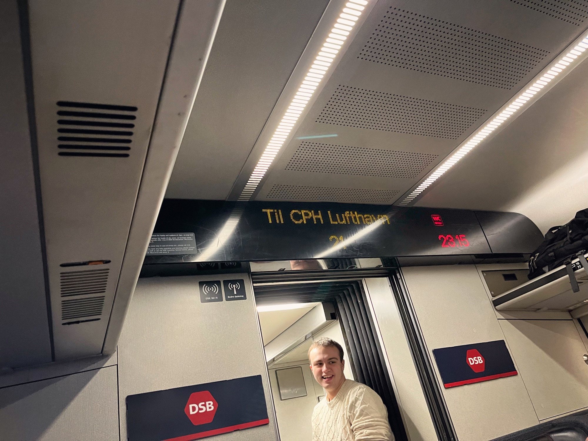 Men vid det laget har vi redan kommit överens med konduktören om att få åka med hela vägen till tågets slutstation som är flygplatsen Kastrup. Detta för att järnvägsstationerna i såväl Köpenhamn som Malmö och Lund stänger på natten medan flygplatsen är öppen dygnet runt. Vi vill inte behöva stå utomhus ett par timmar och vänta på tåg.