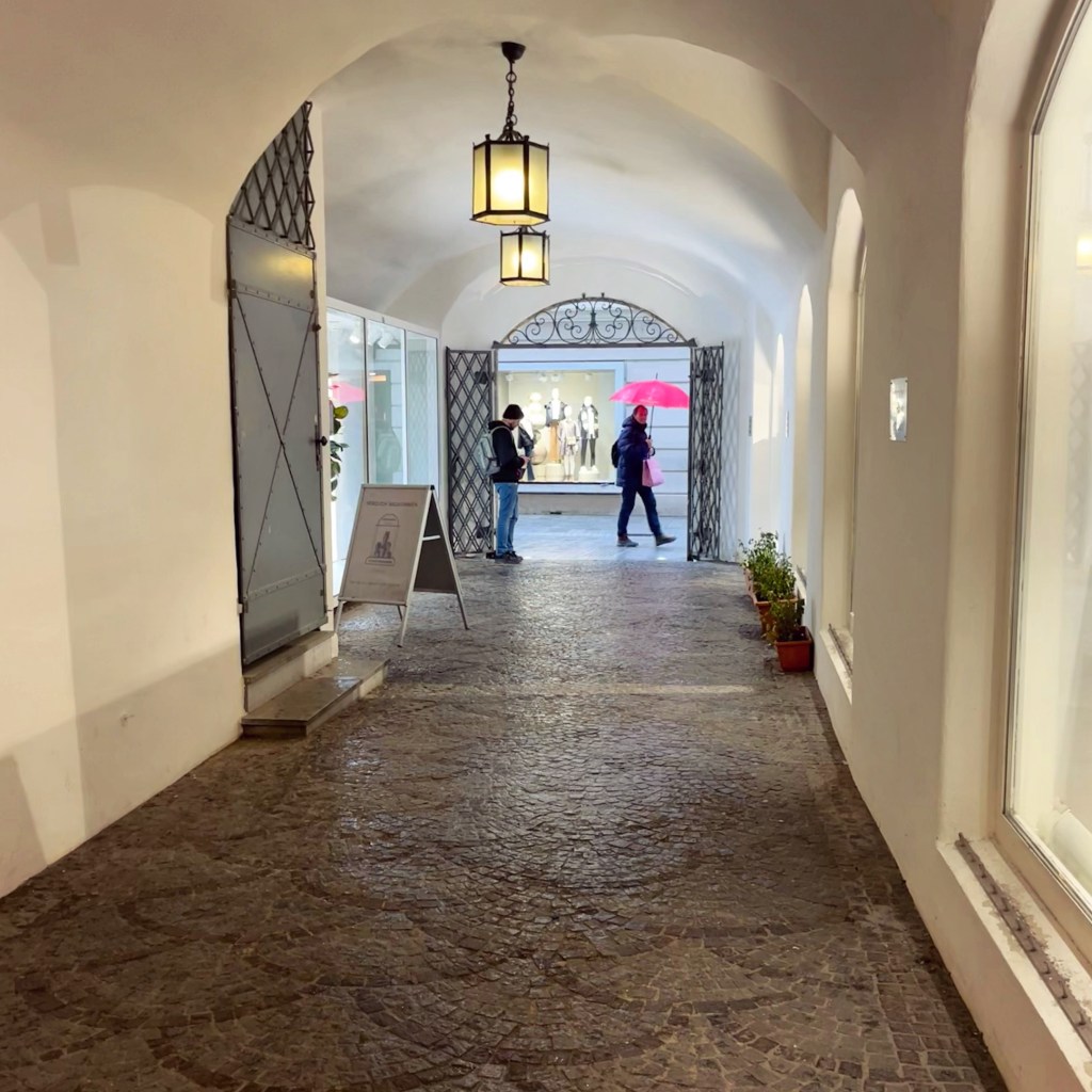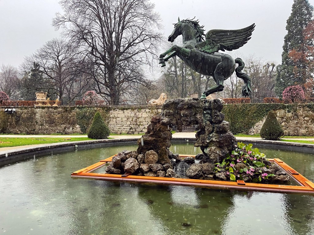 Trevlig regnpromenad i Salzburg, det blir fina blanka gator på fotona. Fotot på passagen med det rosa paraplytet och på Pegasus med det gröna snögloppsvattnet fastnar jag för här.