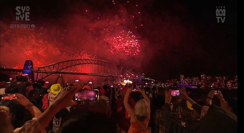 Och raketerna på Sydney Harbour Bridge visas på TV, som alltid. Här ringer de in det nya året med världens, enligt dem själva, och många andra, bästa fyrverkerishow, med pyroteknik som skjuts iväg från förutom Sydney Harbour Bridge även från Sydney Opera House och några av Sydneys övriga landmärken. Totalt pågår fyrverkeriet mellan tio minuter och en kvart och det går åt många ton fyrverkeripjäser. Nio ton enligt uppgift under nyåret 2024-2025. Över 425 miljoner människor runt hela världen väntas se detta årliga fenomen. Du kunde se en Live stream här. Hann du inte kan du se den i efterhand här.