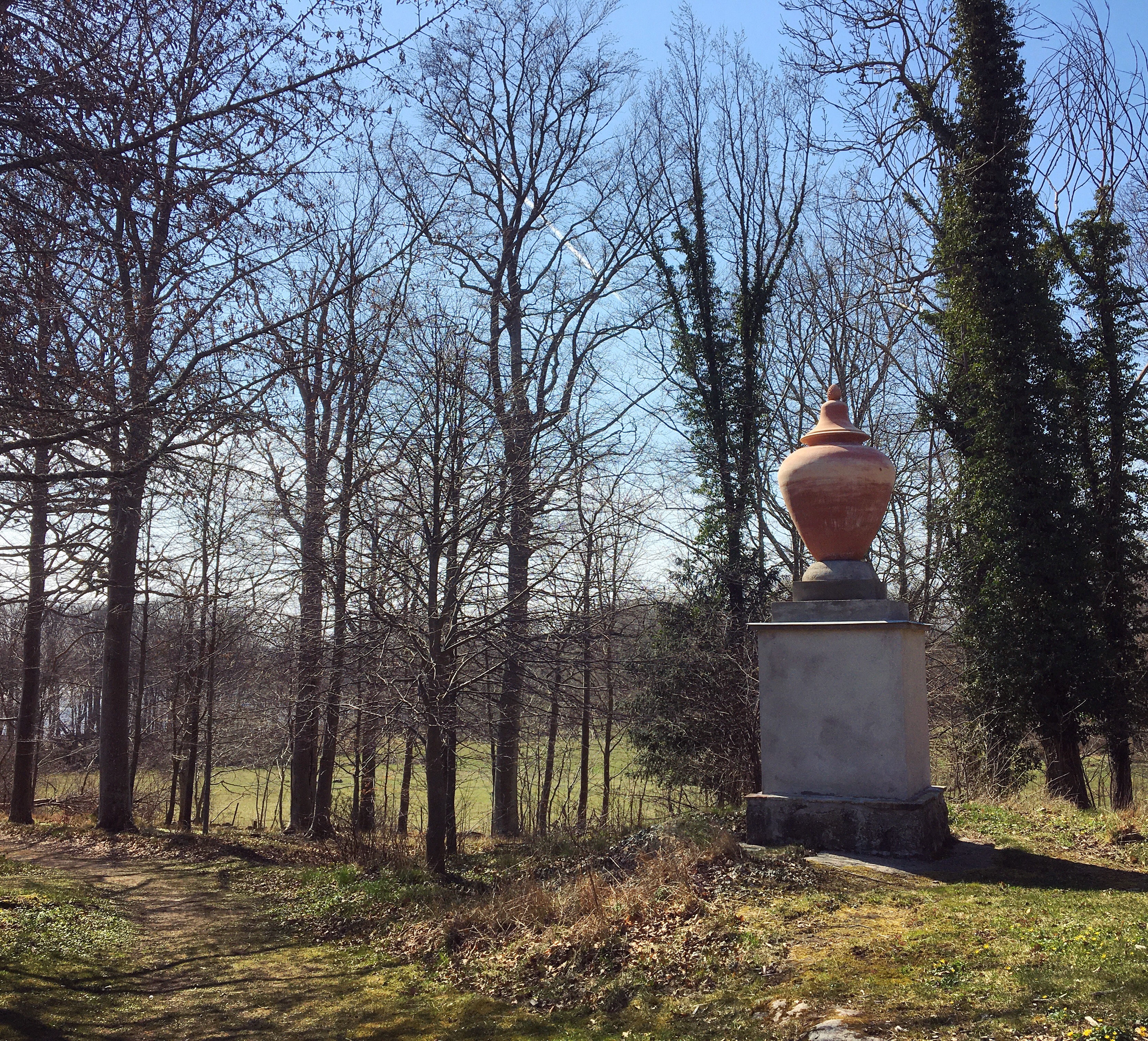 Precis mitt emot den del av huset som liknar ett antikt tempel, och där det står en större urna på ett rejält fundament, kan du följa en stig snett neråt höger, mot havet. Här kan du då också uppleva Skärva naturreservat, som kanske är som allra finast på våren när sipporna blommar.