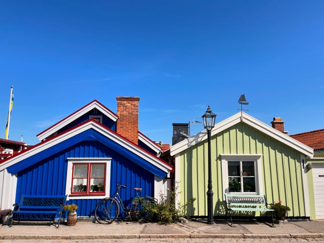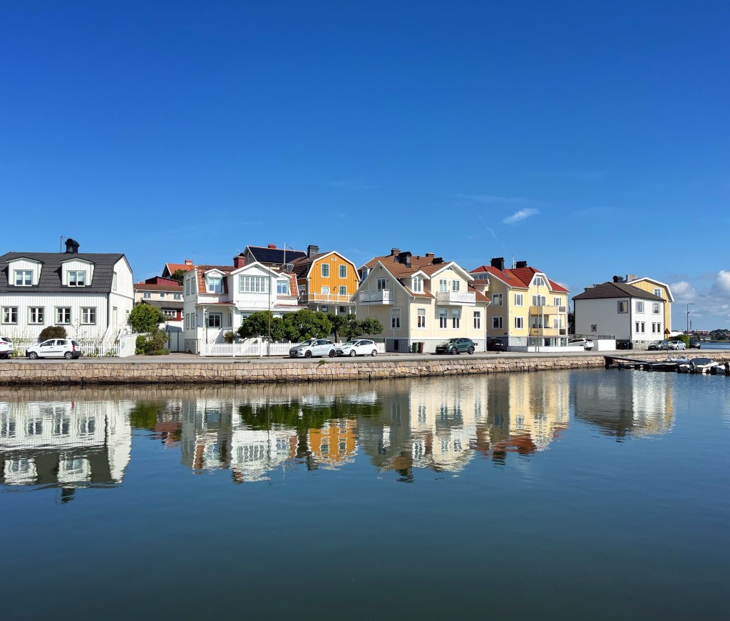 De närmaste bostadsöarna runt Trossö ingår formellt inte i världsarvet men är ändå en del av sammanhanget eftersom de tydligt bidrar till känslan av en stad byggd i skärgården. Jag rekommenderar att du tar en promenad över Ekholmen och Saltö och vidare mot Brändaholm. När du kommit över endera av de två broarna till Saltö är det dags att gå mot norr. Snart är du framme vid den kanske finaste utblicken mot Sveriges kanske gulligaste koloniområde, där bilvägen runt Saltö gör en skarp vänstersväng.