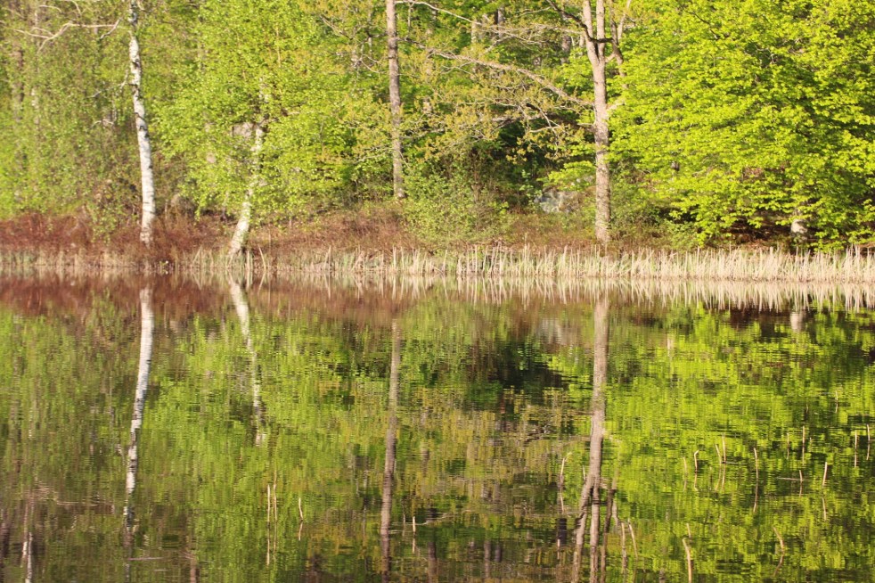 De här bilderna har redan över en vecka på nacken. Det var förra söndagen som vi gick ett varv vid Lilla Kroksjön här hemma i Karlshamns kommun. Härligt när blåbärsriset blommar, tycker jag! Blåbärsris som blommar. Nyutslagna träd speglar sig i Lilla Kroksjön.